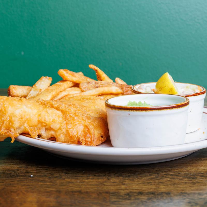 Flaky, tender cod filet, dipped in a crispy beer batter and fried to golden perfection. Served with a side of pub chips, house coleslaw, and a wedge of lemon.