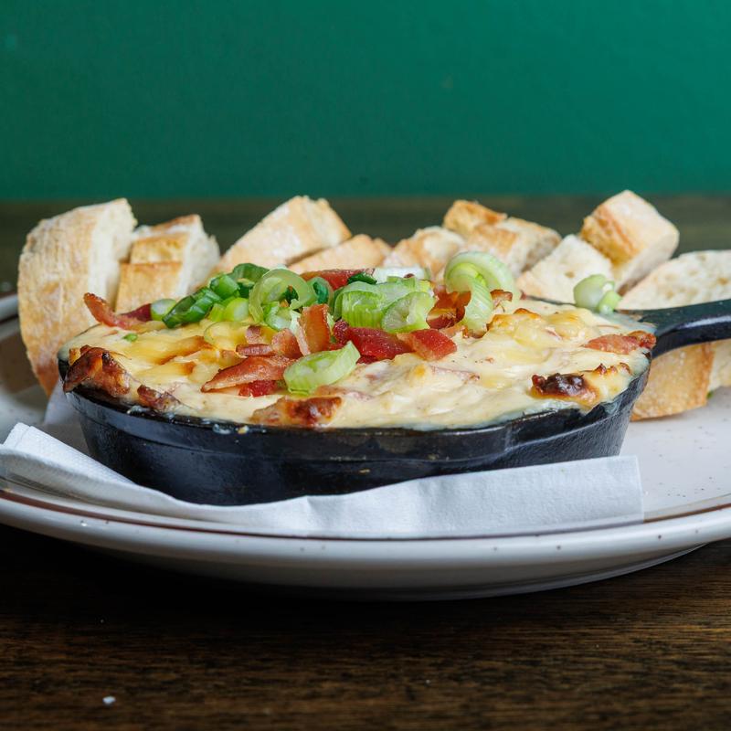 A rich, creamy dip made with smoky Gouda cheese and crispy bacon. Served warm with crispy, toasted baguette slices for dipping.