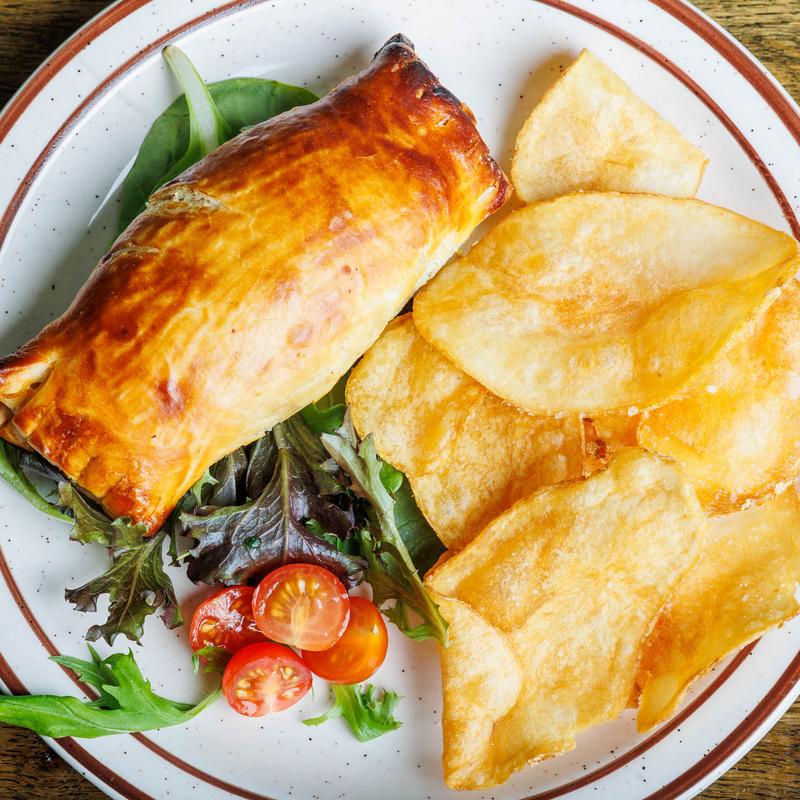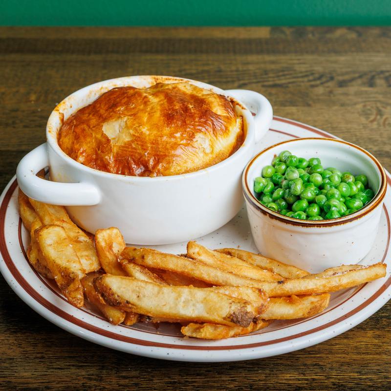 Tender chunks of beef slow-cooked with guinness, hearty carrots, and savory onions, all encased in a flaky, golden pastry. Served with your choice of side salad, pub chips, or vegetable.