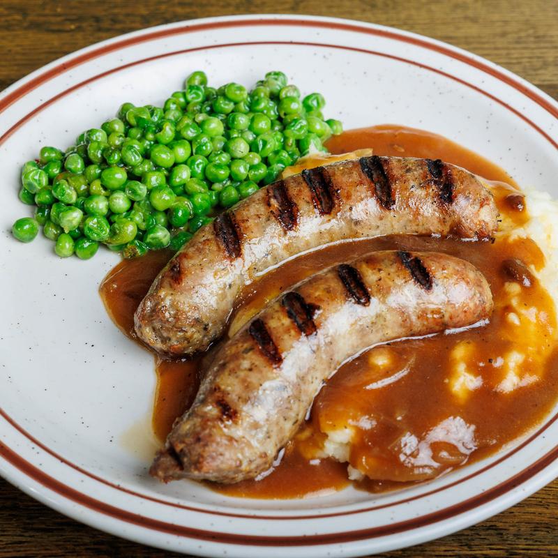 A hearty British favorite featuring three perfectly grilled, juicy sausages served atop a bed of creamy mashed potatoes, and gravy | Add Mushy Peas +$3.00